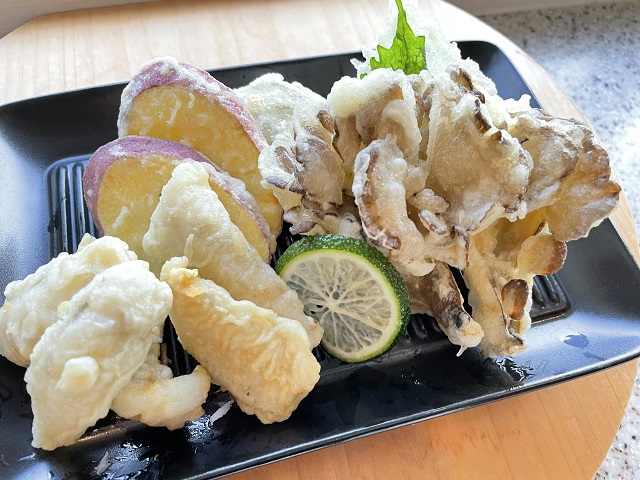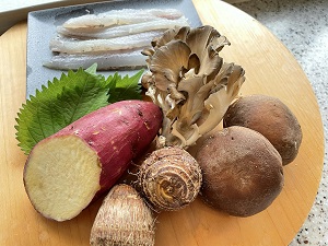 秋の天ぷら 【材料(2人分)】 はも 1本 舞茸 1/2株 椎茸 2枚 里芋 4個 さつまいも、れんこん、茄子、大葉などお好み 天ぷら粉 揚げ油 天つゆ 【材料イメージ】 里芋はレンジで3分チンをして少し火を通しておく。 全ての材料に打ち子をする。 天ぷら粉を薄めに溶く(打ち粉をしておくと薄衣でも衣がはがれにくくなります) さつまいも、里芋は170度で、その他は、180度でガラリと揚げる。 塩または天つゆでいただく。 俊のはもときのこ、里芋たっぷりがおすすめです。