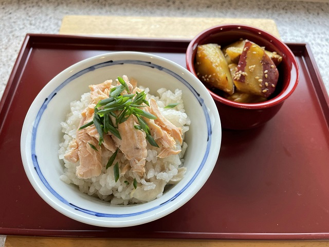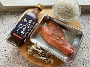 秋鮭の簡単炊き込みご飯 【材料(2人分)】 秋鮭 2枚 舞茸 1/2パック 米 2合 A 水 340㏄ 昆布だし 大1.5 バター 1切れ 醤油 大1(鮭にまぶす用) 【材料イメージ】 鮭の醤油をまぶして10分以上おく。 米を洗いざるにあげておく。 炊飯器に米、舞茸、鮭、Aを入れ炊き上げる。 鮭を取り出し身をほぐし、全て混ぜ込む。
