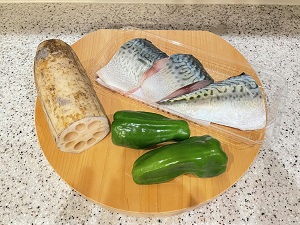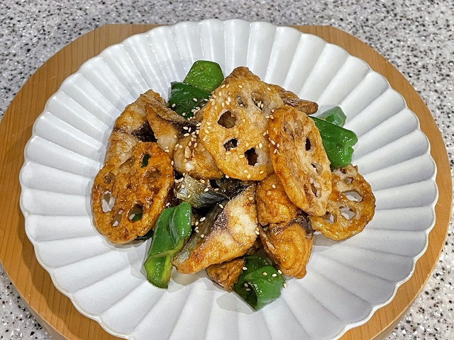 一度油は拭き、Aを熱してとろみがついたところで、れんこん、鯖、ピーマンを入れ絡める。