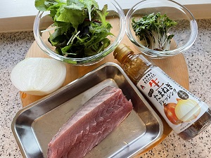 - カツオをスライスし、玉ねぎ、ベビーリーフとともに皿に盛り付ける。